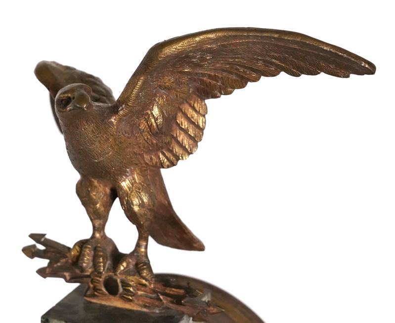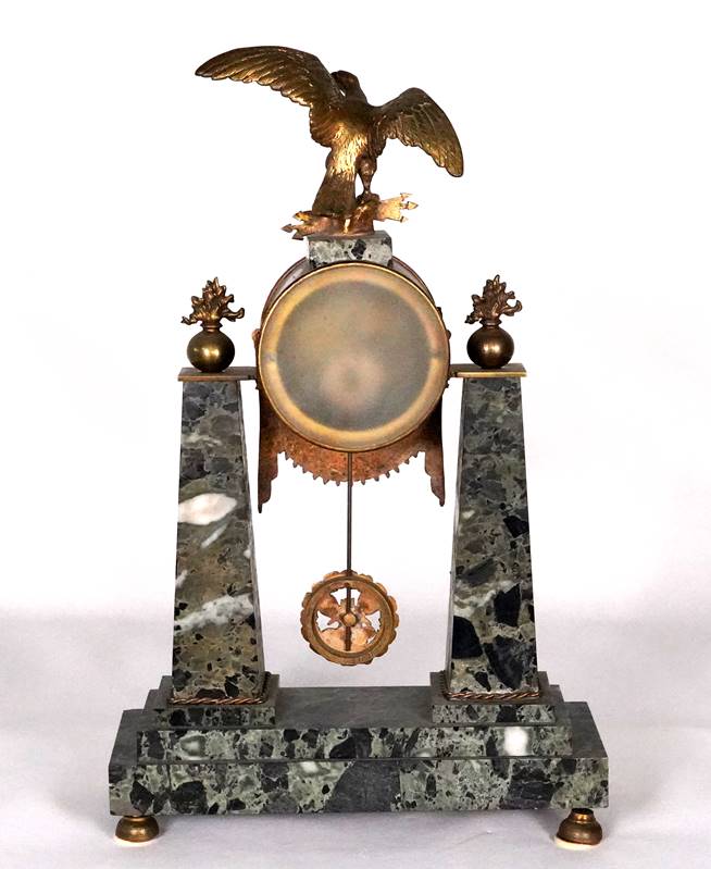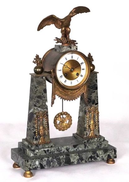 Frankreich um 1900. Grüner Marmor und Bronze. Zwei obeliskförmige Säulen mit Bronzeapplikationen auf zweistufigem Sockel, dazwischen Uhrenzylinder bekrönt mit einem Adler, mit Blitzbündel in den Krallen. Ziffernblatt hinter Glas mit emailliertem Ziffernring mit römischen Stundenzahlen und arabischer Teilminuterie. Pendulenwerk mit Prachtpendel an Federaufhängung. Schlag auf Glocke zur vollen und halben Stunde. Hinten auf Werk Herstellermarke Samuel Marti Paris 1900, mit Nummerierung. Größe ca. 31 x 12 cm, Höhe ca. 50 cm, Gewicht ca. 10,5 kg. Läuft an, Schlag löst aus.