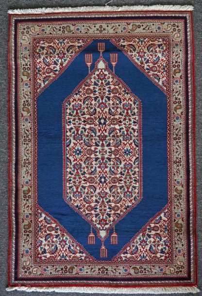 Esfahan Persien 20. Jh. Dreifachbordüre mit blauem Innenfeld mit Medaillon und Eckzwickeln . Verso Etikett mit Provenienz. Größe ca. 166 x 107 cm, ca. 5 x 5 Knoten/qcm. Gewicht ca. 5,5 kg. Zustand wie abgebildet.