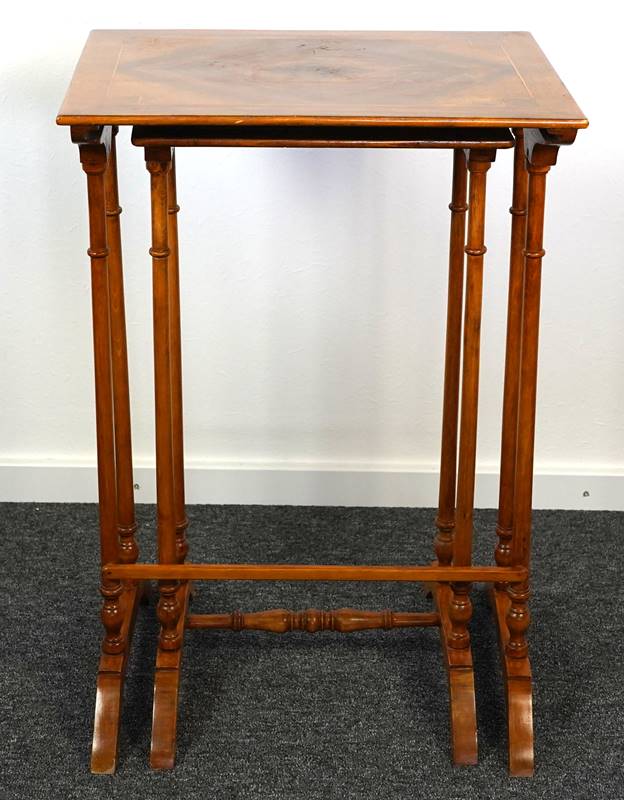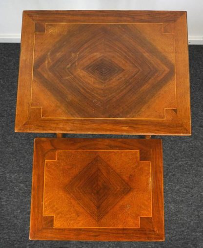 England 20 Jh. Nussbaum. Zwei ineinander passende Tische mit je vier runden Beinen im Verbund auf je zwei Bügelförmigen Füßen. Profilierte Platte mit Intarsien. Maximale Größe ca. 47 x 36 cm, Höhe ca. 71 cm. Minimale Schäden auf der Platte, leicht instabil.
