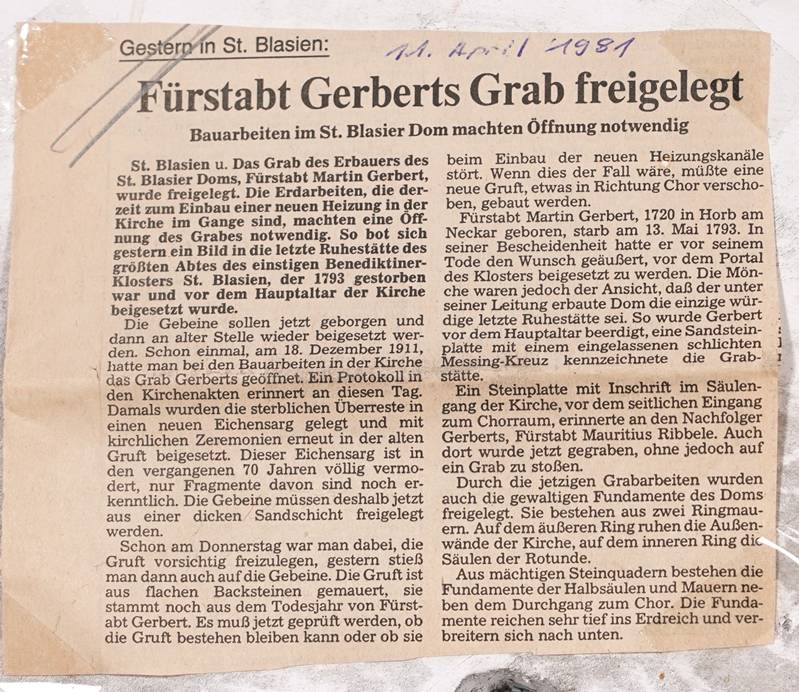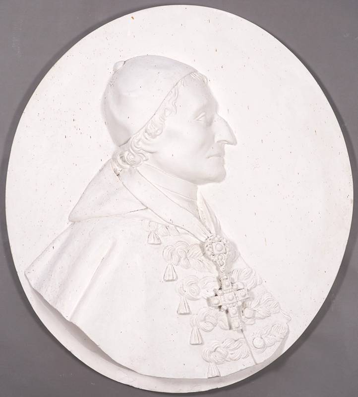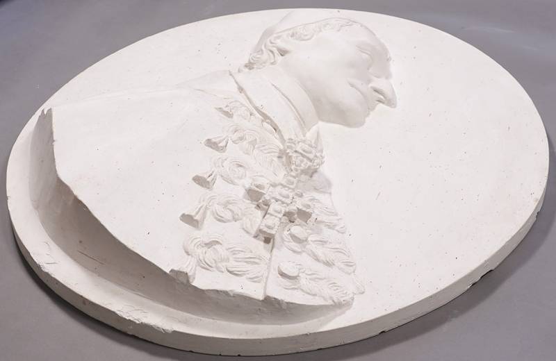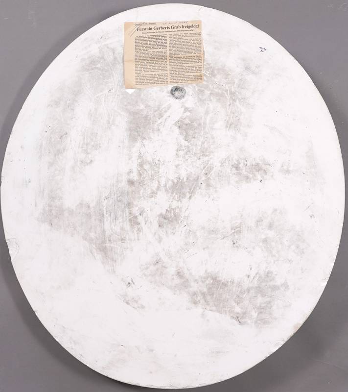 Gipsmedaillon des Fürstabtes Marton Gerbert von St. Blasien (1764-1793). Oben mit Sammleretikett. Größe ca. 71 x 64 cm, Gewicht ca. 18,5 kg. Teils bestoßen. Aus der Sammlung von Hans Jakob Wörner, dem zuständigen Denkmalpfleger bei der Restauration von St. Blasien. Kein Versand möglich, wir empfehlen gerne eine Spedition.