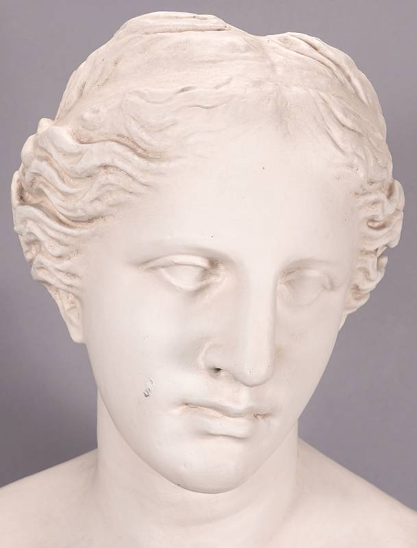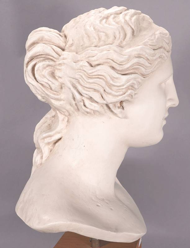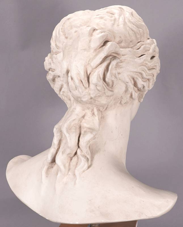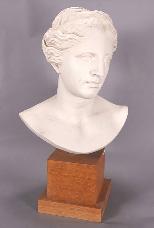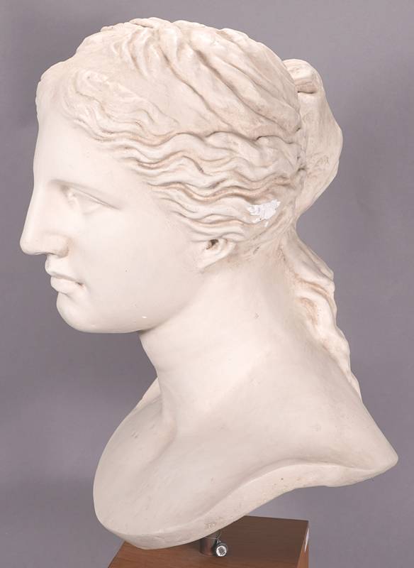 Büste der Hera Wohl Gipsformerei Athen. Gipsbüste der Göttin Hera auf Holzsockel. Am Ständer mit Plombe mit griechischen Schriftzeichen. Am Sockel mit Sammleretikett. Größe ca. 40 x 22 cm, Höhe ca. 70 cm, Gewicht ca. 12 kg. Teils bestoßen. Aus der Sammlung von Hans Jakob Wörner, dem zuständigen Denkmalpfleger bei der Restauration von St. Blasien. Kein Versand möglich, wir empfehlen gerne eine Spedition.