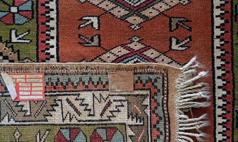 Milas Türkei 20. Jh. Mehrfachbordüre mit Innenfeld in Grün und Orange. Verso Etikett mit Provenienz und ehemaligem Verkaufspreis von DM 2250,-. Größe ca. 170 x 100 cm, ca. 4 x 5 Knoten/qcm. Gewicht ca. 3,9 kg. Zustand wie abgebildet.
