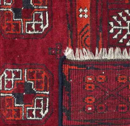 Afghane 20. Jh. Vierfachbordüre mit geometrisch durchgemustertem Innenfeld auf Rot. Größe ca. 214 x 112 cm. Ca. 4 x 3 Knoten/qcm.