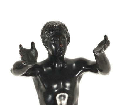 Sonnenanbeter Oskar Gladenbeck GmbH um 1933. Bronze auf Marmorsockel. Betender Knabe mit zum Himmel geöffneten Armen. Wohl nach einem Vorbild aus der griechischen Antike. Hinten am Sockel bezeichnet. Größe ca. 10 x 10 cm, Höhe ca. 41 cm. Gewicht ca. 3,5 kg. (Nr. 54) Sun worshipper. Oskar Gladenbeck GmbH c. 1933. Bronze on marble base. Praying boy with arms open to the sky. Probably after a model from Greek antiquity. Inscribed on the back of the base. Size approx. 10 x 10 cm, height approx. 41 cm. Weight approx. 3.5 kg.