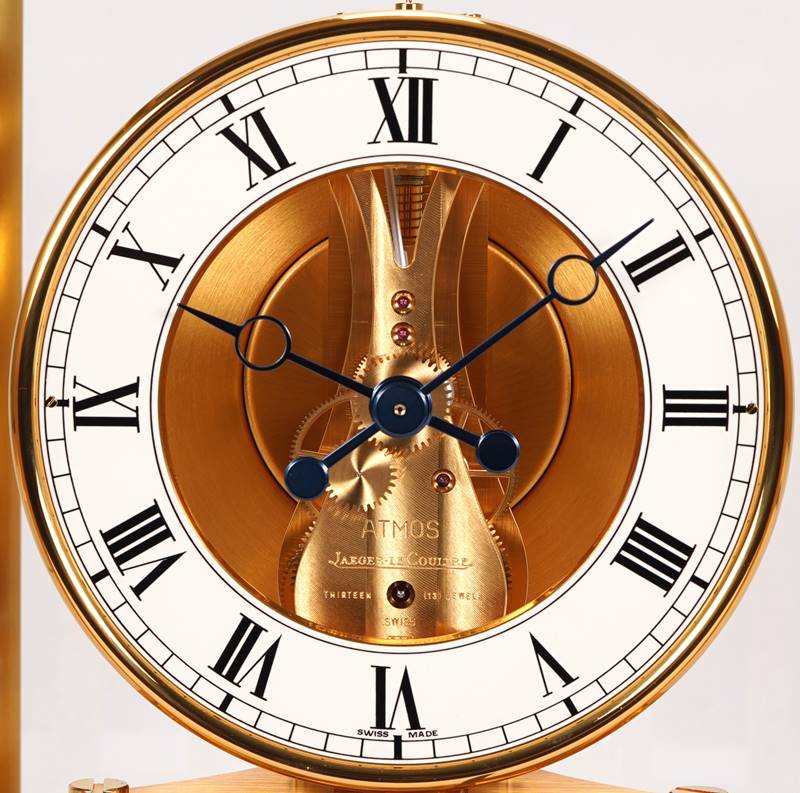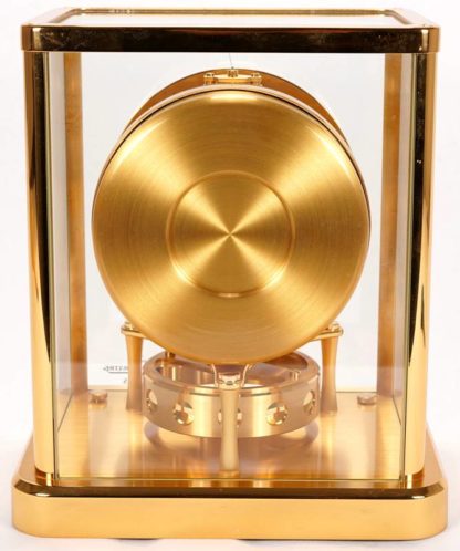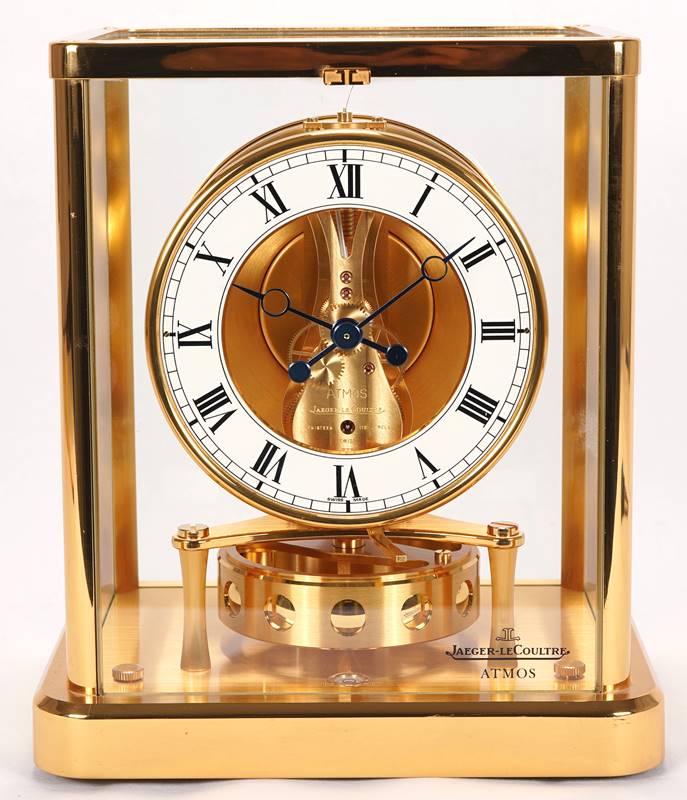 Jaeger-LeCoultre Atmos Schweiz 20. Jh. Vergoldetes Messing und Glas. Rechteckiger Korpus mit abgerundeten Ecken. Fünf Seiten verglast. Weißer Ziffernkreis mit römischen Stundenzahlen und schwarzen Breguet-Zeigern. Aufzug über Aneroid-Dose (Temperaturschwankung von 1° Grad reicht für Gangdauer von 48 Stunden) mit Torsionspendel. Bezeichnet auf Frontglas sowie Uhrwerk, auf Uhrwerk nummeriert 540 und oben Seriennummer 693306. Frontglas herausnehmbar, Sockel mit Justierschrauben für eine ganggenaue Aufstellung, Hebel zur Arretierung der Mechanik bei Transport. Größe ca. 20 x 15 cm, Höhe ca. 23 cm. Läuft nur an. Kein Versand möglich, nur Abholung.