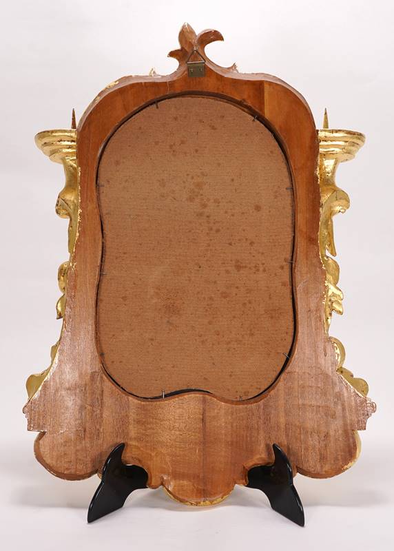 Barock Spiegel 20. Jh. Holz, geschnitzt, goldfarbig gefasst. Das geschnitzte Rahmendekor wird aus Rocaillen und Rosenblüten gebildet. Zu beiden Seiten des Spiegels befindet sich jeweils eine Haltevorrichtung für eine Kerze. Größe ca. 49 x 35 cm.