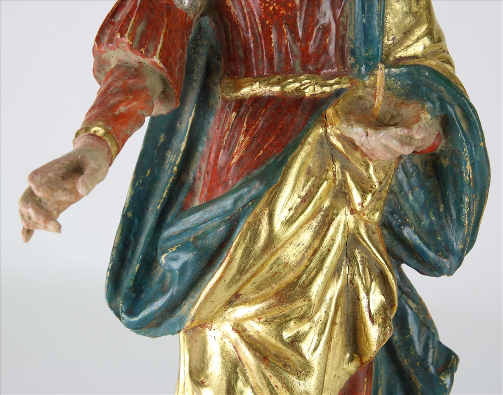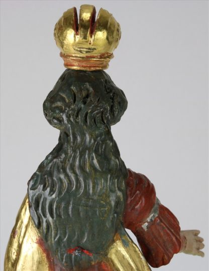 Spanischer Barock wohl 19. Jh. Stehende Figur auf Rocaillensockel. Holz geschnitzt und polychrom staffiert. Größe ca. 16 x 10,5 cm, Höhe ca. 40 cm.