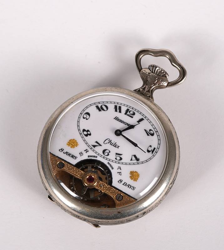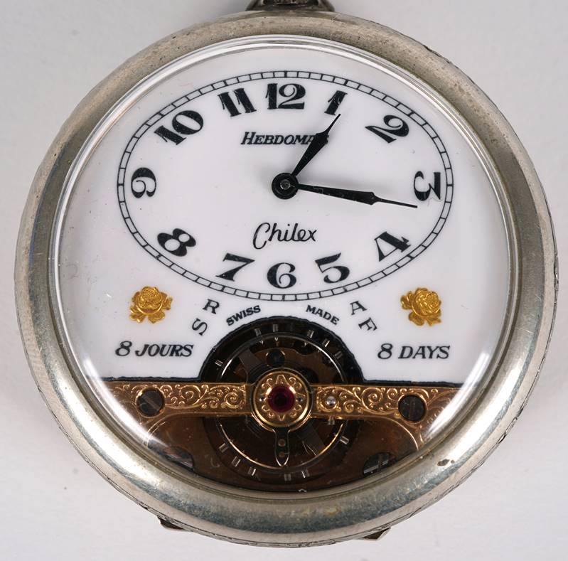 Schweiz Anfang 20. Jh. Hebdomas Chilex. Ovaler Ziffernkreis mit arabischen Stundenzahlen auf Porzellan mit Bezeichnung. Darunter offen liegende Unruhe unter einem Rubin. Rückwertiger Deckel mit reliefierter Darstellung der Scientia. Acht- Tage- Werk. Größe ca. 6,5 x 5 cm. Unruhelager wohl ausgeschlagen, läuft nur in aufrechter Haltung.