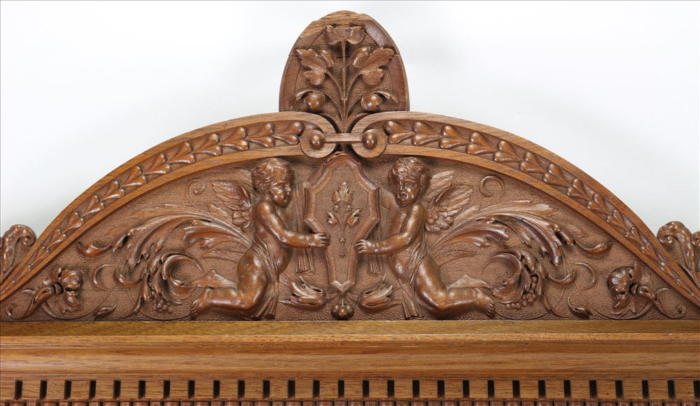 Deutsch um 1900. Unbekannter Künstler. Madonna mit Jesuskind. Mehrteilig gearbeitet. Reich und sehr fein im Hochrelief geschnitzt und verschiedenfarbig patiniert, teils auch intarsiert. Größe komplett ca. 98 x 53 cm. Guter Zustand, teils etwas bestossen.