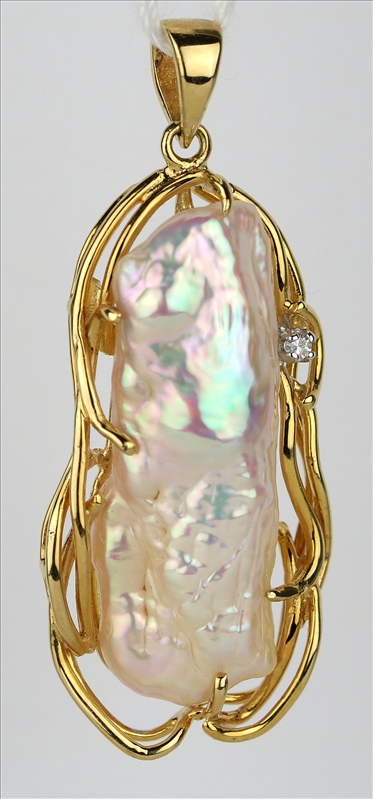 Deutsch 1980-er Jahre. GG 585 punziert. Ovale unregelmäßig geformte Perle in durchbrochen gearbeiteter Fassung mit einem Punktdiamanten. Länge gesamt ca. 3,5 cm, Gewicht ca. 3,5 Gramm.