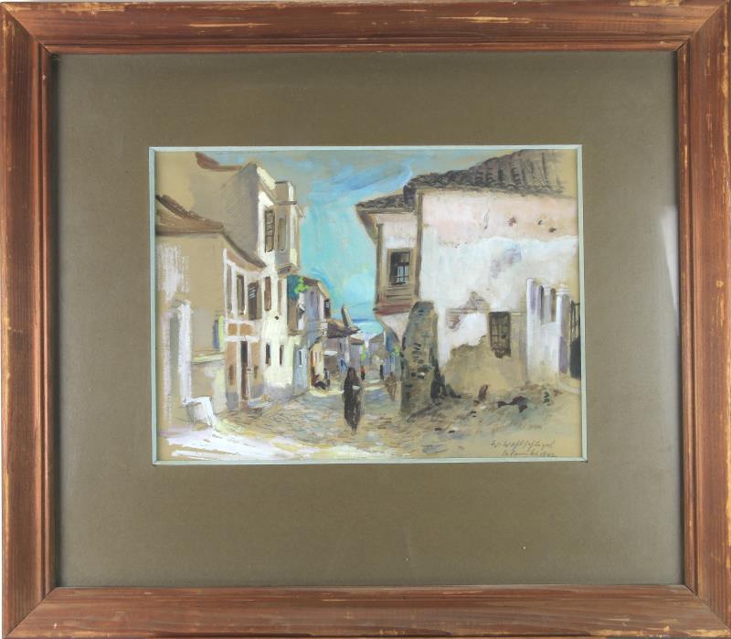 1907 Tumringen - 1999 Freiburg im Breisgau. Blick in die Straßen einer südlichen Stadt. Gouache auf Papier. Unten rechts signiert, bezeichnet und datiert 1942. Größe ca. 20 x 28 cm, hinter Glas gerahmt ca. 40 x 47 cm. Guter Zustand.