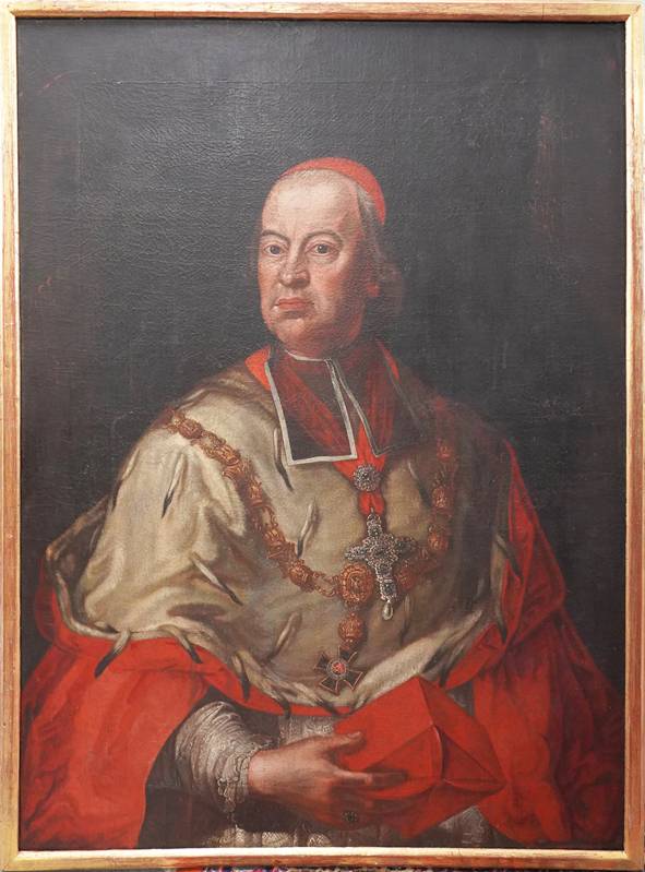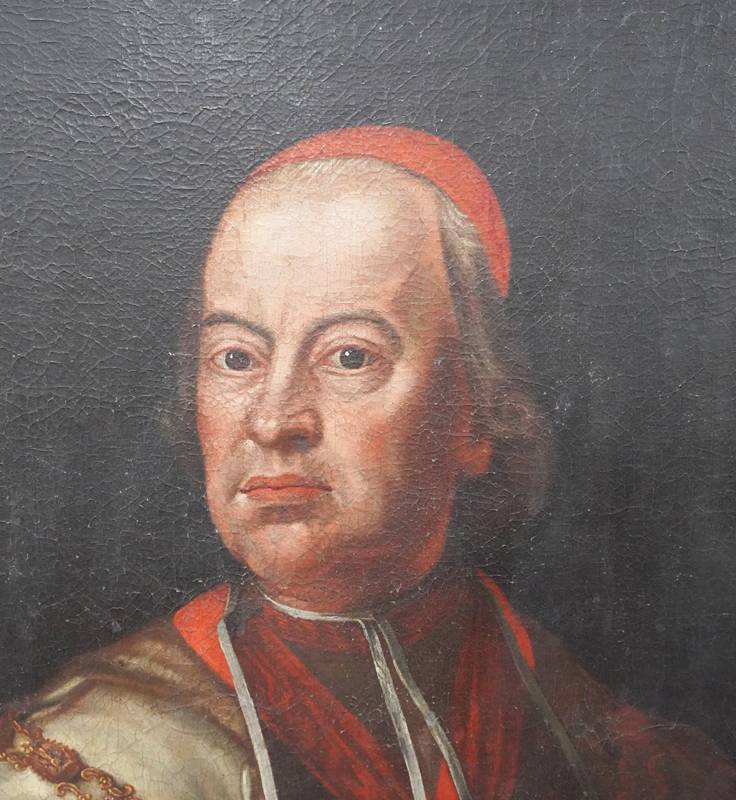 Deutsch 18. Jh. Bildnis des Kardinals Franz Konrad von Rodt (1707-1775), Fürstbischof von Konstanz mit dem Großkreuz des k.u.K. Sankt Stephans-Ordens. Öl auf Leinwand, doubliert. Größe ca. 112 x 82 cm, Rahmen ca. 114 x 84 cm. Teils Farbverlust, teils Craquelé.
