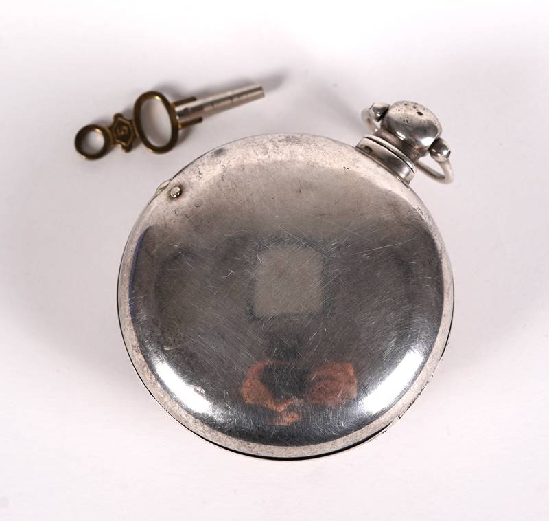 Birmingham 1822. Silbergehäuse 925. Kupfer Ziffernblatt mit Einzeiger und Tages- und Nachtphasen. Arabische Minuterie im Außenkranz, lateinische Stundenzahlen im Halbkreis über den Tages- und Nachtphasen. Der Strich zwischen Tag und Nacht dient hier als Zeiger. Übergehäuse und hinterer Deckel punziert mit laufendem Löwen, Stadtmarke, Jahresbuchstabe und Herstellermarke Vale & Rotherham. Unruhe unter hochfeiner, durchbrochen gearbeiteten Brücke auf Platine. Dort bezeichnet W. Waight 1891 Birmingham. Spindelwerk mit Schlüsselaufzug. Größe ca. 6,5 x 5,5 cm, Gewicht ca. 145 Gramm. Läuft an, Schlüssel anbei.