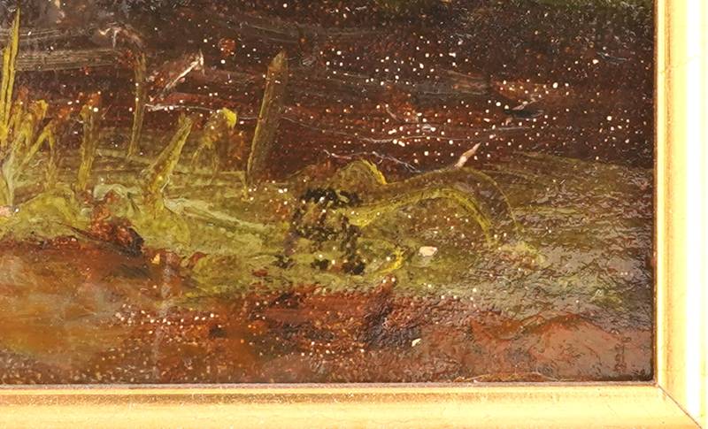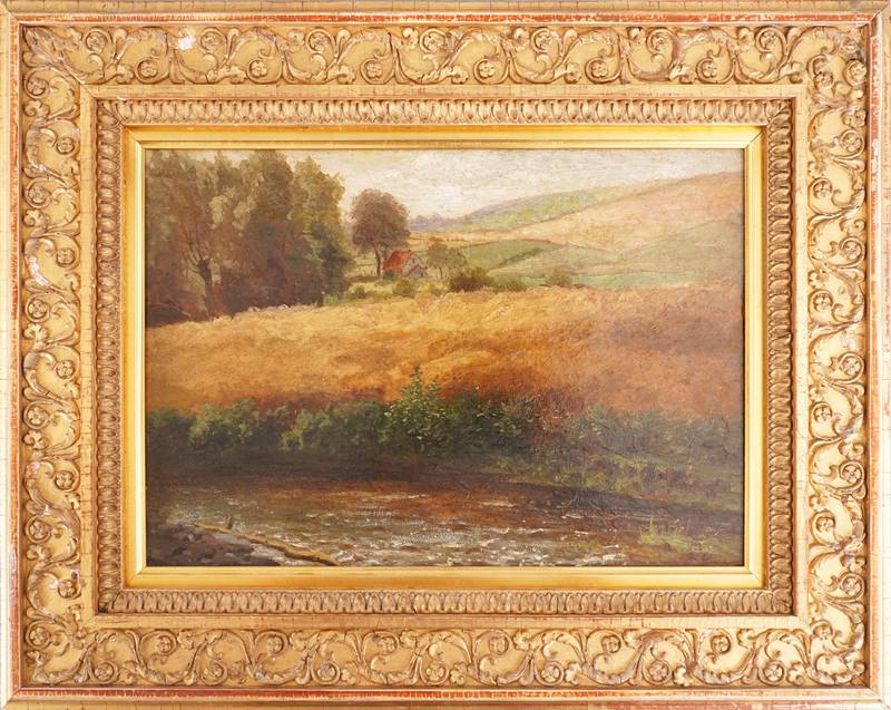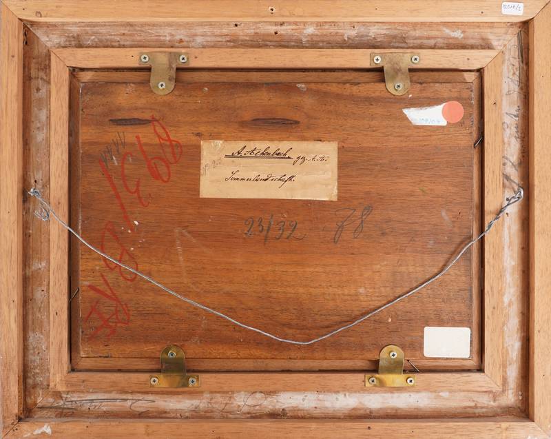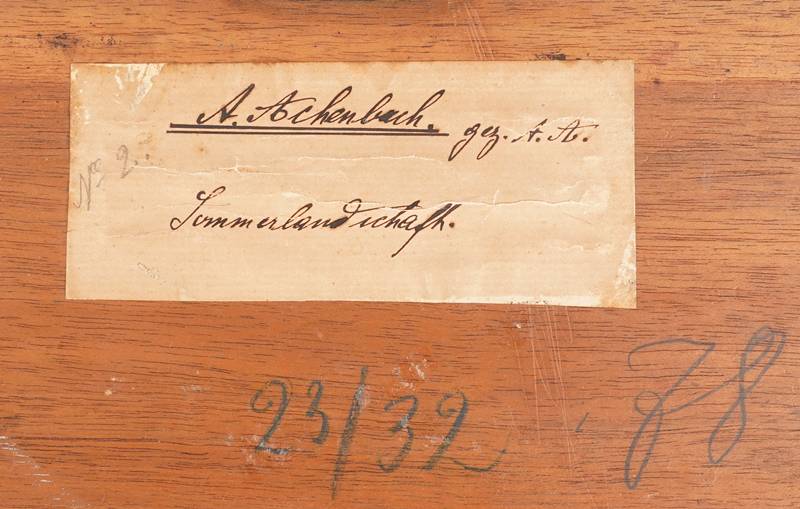 Achenbach, Andreas 1815 Kassel - 1910 Düsseldorf. "Sommerlandschaft". Öl auf Leinwand auf Holz. Sommerlandschaft mit goldenen Feldern und einem Fluss im Vordergrund. Unten rechts monogrammiert "AA", darunter unleserlich bezeichnet. Verso auf der Platte eine altes Sammleretikett, handschriftlich bezeichnet. Größe ca. 23 x 32,5 cm, Rahmen ca. 37 x 46 cm.