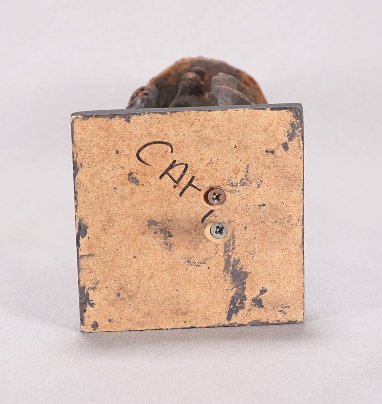 Ahnenfigur Dogon 19. Jh. Holz, vollrund geschnitzt, dunkel patiniert, auf schwarz gefasstem Holzpodest. Menschliche, sitzende Figur. Größe ca. 10 x 10 cm, Höhe ca. 30 cm. Teils bestoßen, altersbedingter Zustand wie abgebildet.