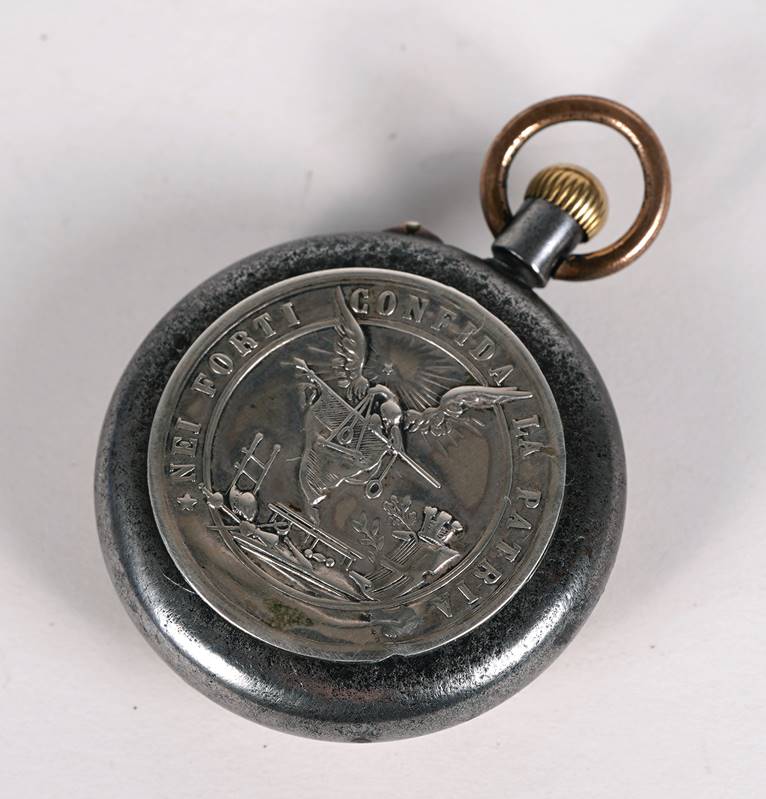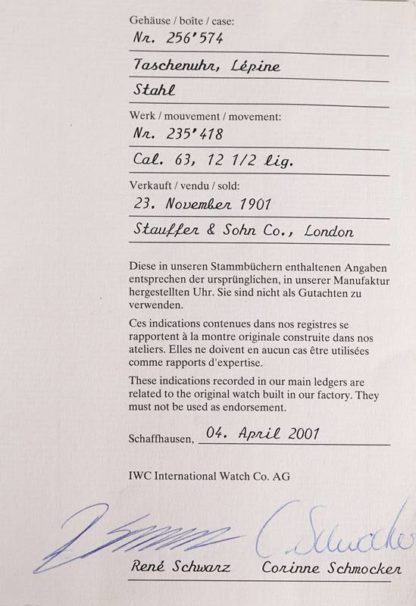 Schaffhausen vor 1901. International Watch Co. Stahl. Emailliertes Ziffernblatt mit römischen Stundenzahlen und Sekunde bei der sechs. Auf dem Ziffernblatt bezeichnet. Verso Medaille Nei forti confida la patria. Kronaufzugswerk. Größe ca. 4 x 3 cm, Gewicht ca. 29 Gramm. Läuft an. Anbei Stammbuchauszug mit Hinweis auf Kauf 1901 bei Stauffer und Sohn Co, London.