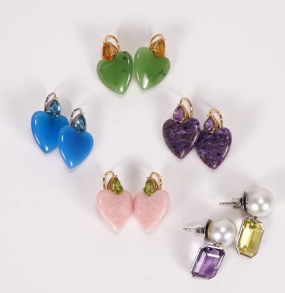 Fünf Paar Ohrstecker 1990-er Jahre. 4 x Gelbgold/Wei0ßgold 750 punziert. Jeweils Edelsteine in Herzform mit facettierten meist anderen Farbsteinen in der Goldmontur. Länge je ca. 28 mm, Gesamtgewicht ca. 32,7 Gramm. Dabei ein Paar Modeschmuckanhänger mit Kunstperlen und Farbsteinen.