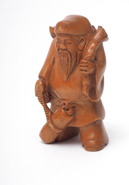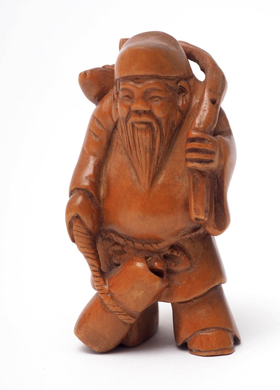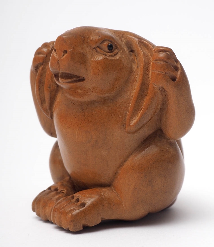 Japan Meiji Zeit. Sitzender Hase, zwei alte Herren mit Bündel und ein sitzender Affe. Buchsbaum, zwei mit Glasaugen, drei signiert. Höhe ca. 5 -7 cm.