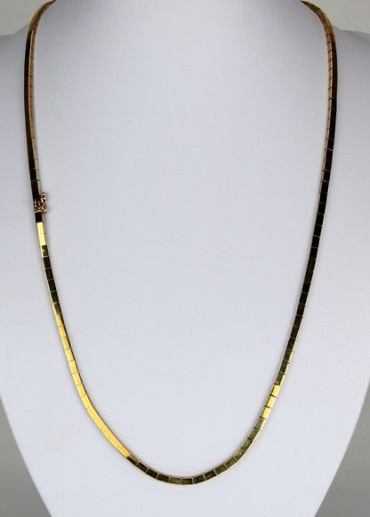 Collierkette Deutsch 1980er Jahre. GG 750 punziert und Meistermarke HW. Oblonge Glieder und Kastenschloß mit Verschlußacht. Länge ca. 50 cm, Gewicht ca. 25 Gramm.