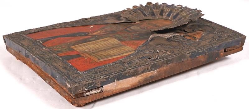 Ikone Russland um 1900. Heiliger Nikolaus. Tempera auf Kreidegrund auf Holz mit versilberter Oklade. Unten mit einer Punze, verso mit Etikett. Größe ca. 32,5 x 26 cm. Teils stärker bestoßen. Aus einer Pfälzer Privatsammlung.