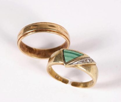 Zwei Goldringe Gelbgold 585, Gewicht zusammen ca. 7,4 Gramm. Ehering mit Gravur und einer aufgesägt.