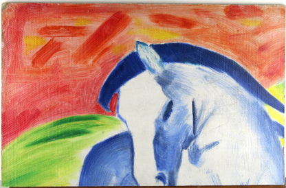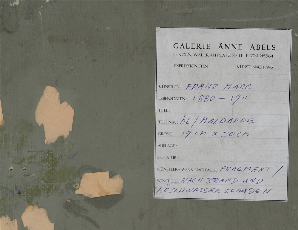 1880 München - 1916 Verdun. Fragment eines Pferdekopfes. Öl auf Malpappe hinter Glas gerahmt. Größe ca. 19 x 30 cm, Rahmen ca. 50 x 59 cm. Verso altes Galerieetikett von Anne Abels in Köln. Bezeichnet und erläutert als Fragment nach Brand- und Löschwasserschaden. Beiliegende Versandpapiere aus 1972 mit Provenienz Christie Mansion & Woods in London. Schöner Zustand.