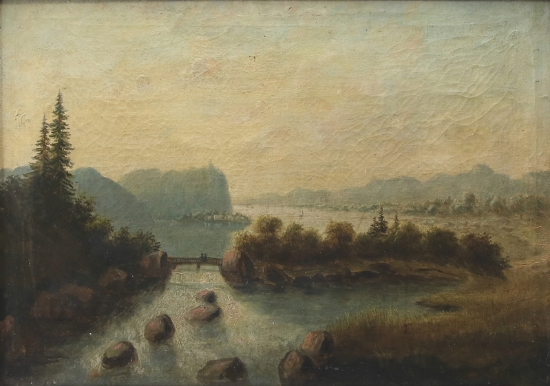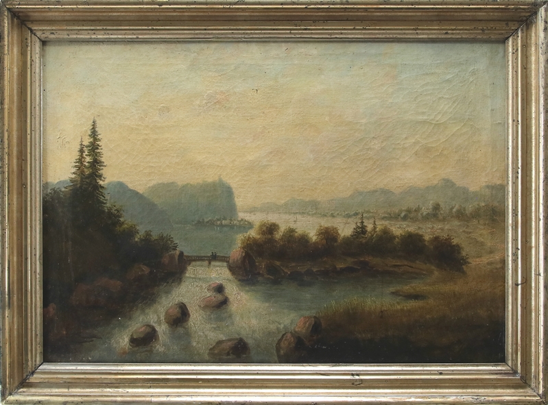 Wohl deutsch 19. Jh. Landschaft mit Wasserfall (evtl. der Rheinfall). Öl auf Leinwand. Größe ca. 48 x 68 cm, Rahmen ca. 58 x 78 cm.