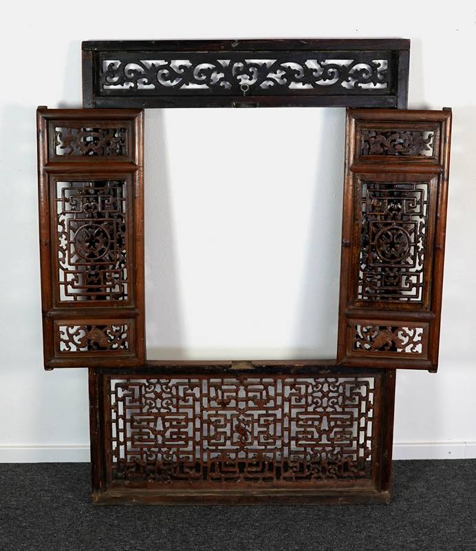 China, wohl Qing-Dynastie (1644-1911). Holz. Sehr fein in Durchbrucharbeit geschnitzt. Fenster mit zwei Flügeln, bestehend jeweils aus drei Feldern. Diese sind oben und unten mit ornamentalem Ranken Muster gefüllt und mittig mit eckigen Spiralen und floralen Formen. Im Feld über den Fenstern wiederholt sich das Ranken Muster. Seitlich befinden sich je zwei Felder mit erneut eckigen Spiralen und floralen Formen. Unterhalb ist ein großes Feld mit einem zentralen Medaillon, darin ein Kranich. Umgeben wird es von eckigen Spiralen und floralen Formen. Die Flügel sind herausnehmbar. Größe ca. 141 x 95 cm. Teils restauriert, teils beschädigt. Zustand wie abgebildet, bitte selbst besichtigen.