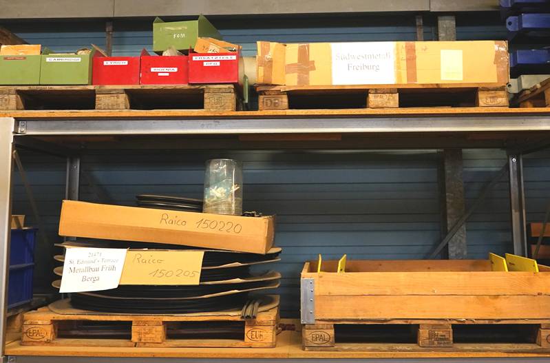 Regalinhalt diverse Befestigungsteile, Winkel, Stahlunterlagen in einem Element mit vier Ebenen