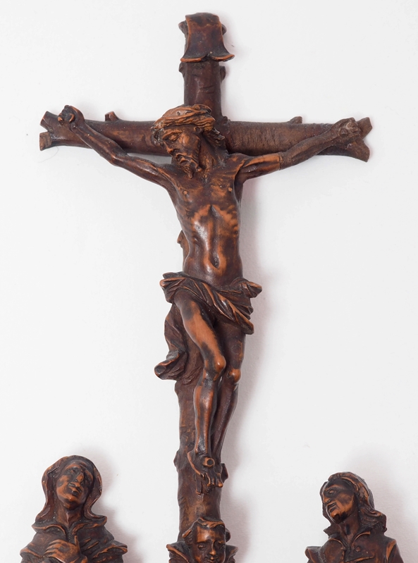 Franken, wohl Würzburg um 1670. Holz geschnitzt und patiniert. Fein gearbeitete barocke Golgathagruppe mit der trauernden Maria Magdalena und Johannes. Größe ca. 9 x 5 cm, Höhe ca. 21 cm. Passender, späterer Sockel. Guter Zustand.