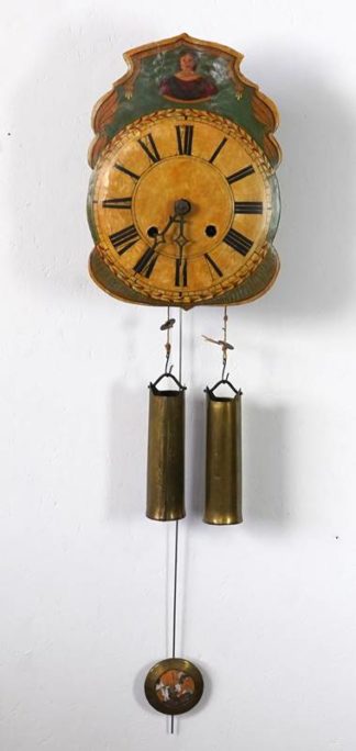Frankreich um 1900. Oben halbrund abgeschlossenes Holzschild mit floraler Bemalung und Ziffernblatt mit römischen Ziffern und arabischer Teilminuterie. Darauf bezeichnet Poirier à Boulzicourt. Messingräderwerk mit Pendel, Gewichtsaufzug, Schlag zur vollen Stunde auf Glocke. Größe ca. 33 x 22 cm. Läuft an, Schlag löst nicht richtig aus. Seitliche Türen fehlen. Craquelé, teils Farbverlust.