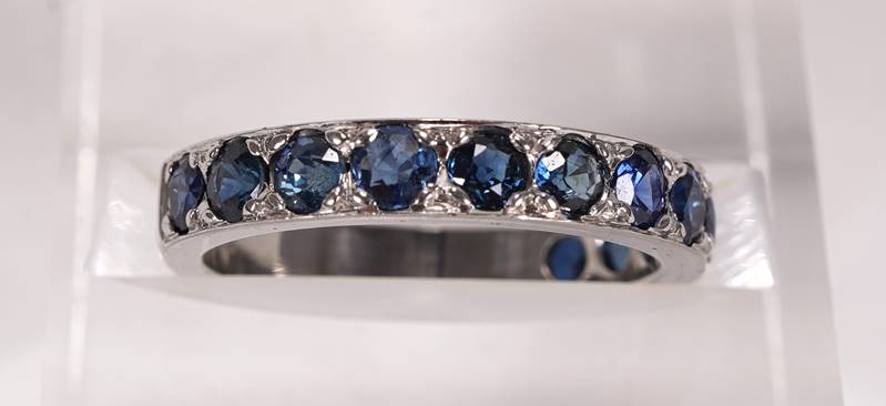 Halbmemoryring Deutsch 1980-er Jahre. Weißgold 585 punziert und Meistermarke. Glatte Schiene mit 12 wohl behandelten etwas unterschiedlich blauen Saphiren. Ringgröße ca. 54 bzw. 17, Gewicht ca. 3,9 Gramm.