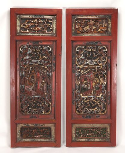 China um 1900. Geschnitztes Holz, goldstaffiert und polychrom gefasst. Zwei je dreiteilig aufgebaute Tafeln. Im oberen und unteren Bereich florale Schnitzereien. Mittig ein von durchbrochen gearbeiteten, floralen Schnitzereien umgebenes Bildfeld mit einer figuralen Szene. Größe ca. 30 x 4 cm, Höhe ca. 81,5 cm, Gesamtgewicht ca. 5,04 kg. Teils bestoßen, teils berieben.