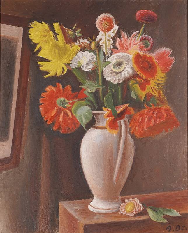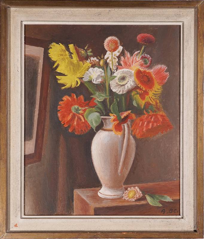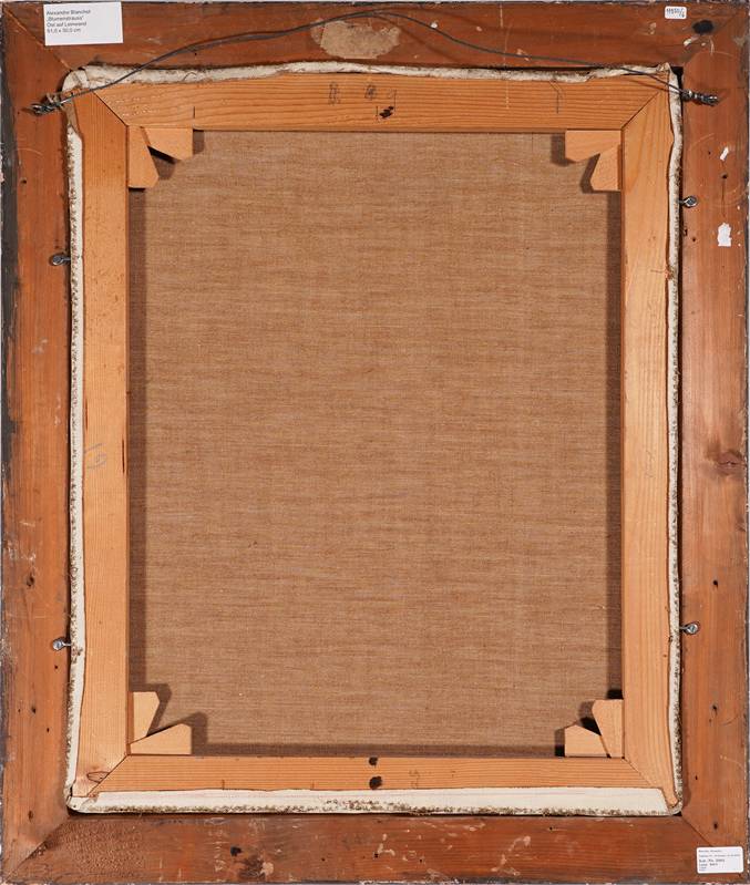 1882 Pforzheim - 1961 Genf. "Blumenstrauß". Öl auf Leinwand. Unten rechts monogrammiert. Verso auf der Rahmenrückwand ein gedrucktes Etikett mit den Angaben zum Werk. Größe ca. 61 x 50 cm. Rahmen ca. 74,5 x 63 cm.