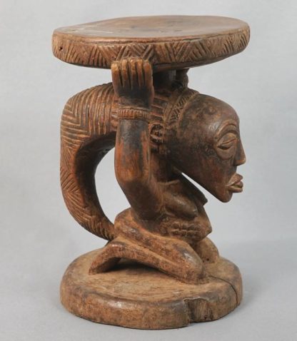 D.R. Kongo, Hemba. Holz, geschnitzt, dunkel patiniert. Karyatidenhocker aus einem Holzstück geschnitzt. Knieende Frau als Trägerin mit kunstvoller Frisur und mit Narbentatauierungen auf dem Bauch. Größe ca. 25 x 23 cm, Höhe ca. 30 cm. Gewicht ca. 2,6 kg. Teils mit Spannungsrissen, teils Ausbrüche, ein Arm mit durchgehendem Riss. Das Objekt stammt aus der süddeutschen Privatsammlung Dr. Hartmut Brie. Die Skulpturen der Hemba zählen zu den bedeutendsten Kunstwerken Schwarzafrikas. Es sind vor allem Ahnenfiguren sowie Doppelbecher, Zeremonialstäbe, Karyatidenhocker, Zeremonialäxte und anderes Kultgerät.