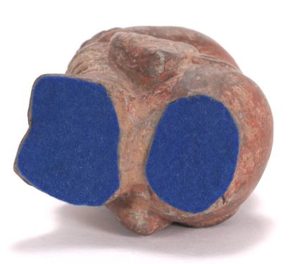 China ca. 400 n. Chr. (wohl Nördliche Wei-Dynastie). Gebrannter Ton, Irdenware, mit Resten roter Fassung. Die Figur hockt mit geschlossenen Beinen, ihren Kopf hält sie gesenkt auf ihrem linken Unterarm. Mit ihrer Rechten hält sie sich am Nacken fest. Mit Thermolumineszenz-Gutachten des Laboratory Ralf Kotalla vom 09.09.2002, welches den letzten Brennzeitpunkt der Figur auf vor 1600 Jahren +/- 320 errechnet hat. Größe ca. 9 x 11 cm, Höhe ca. 16 cm. Bohrloch zur Probeentnahme am Hinterkopf. Unter dem Boden wurde Filz angebracht, darunter ist wohl das zweite Bohrloch. Gutachten anbei.