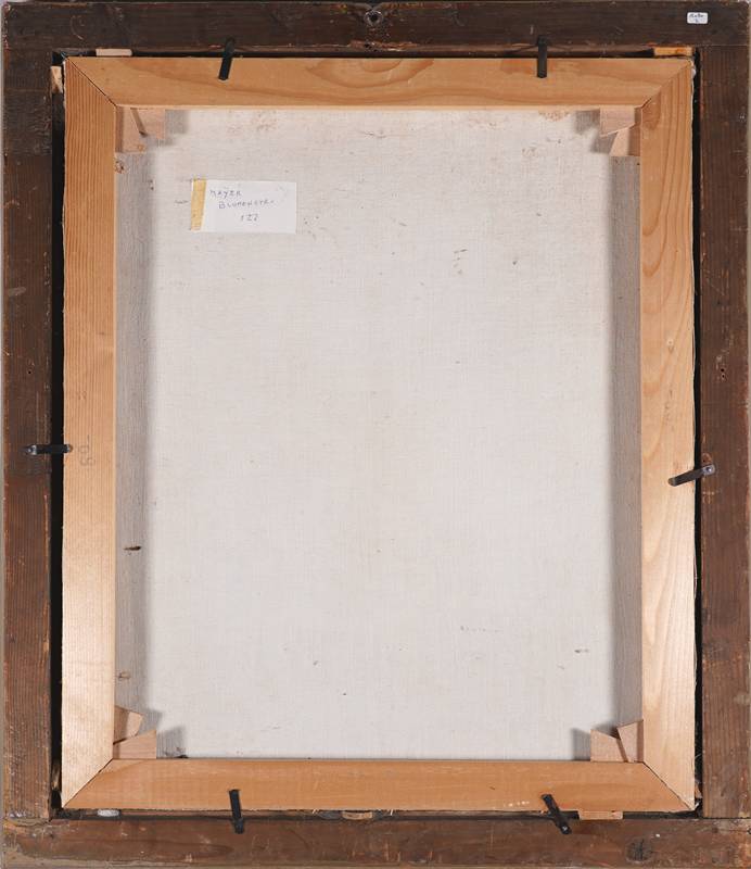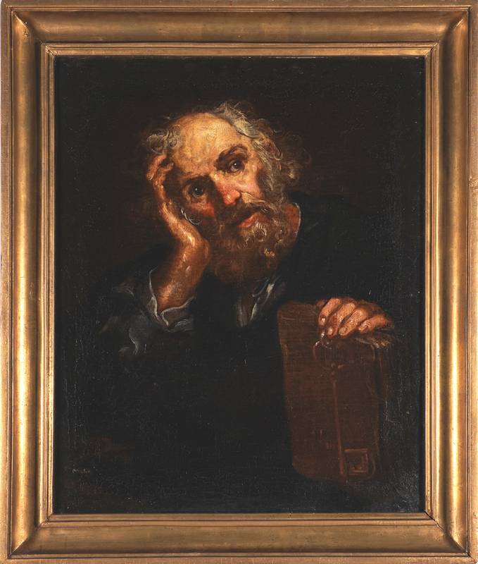 Umkreis/Nachfolge. Heiliger Petrus mit Buch, Schlüssel und sorgenvoller Miene. Öl auf Leinwand (doubliert). Verso mit ehemaligem Besitzer-Vermerk. Größe ca. 69 x 56 cm, Rahmen ca. 82 x 69 cm. Teils starkes Craquelé, Leinwand teils wellig.