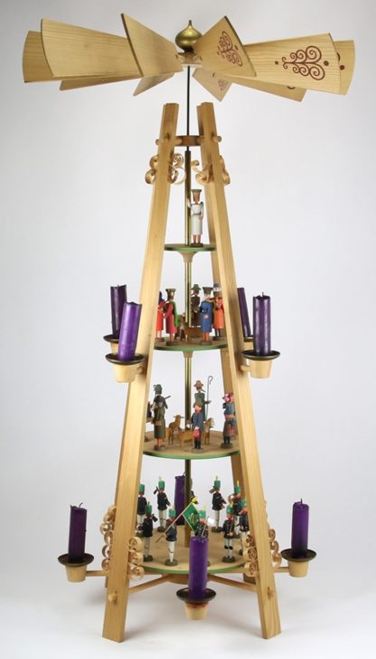 Erzgebirge um 1950. Fabrikat Vero in der originalen Verpackung. Dreistöckig mit zahlreichen Figuren. Durchmesser ca. 53 cm, Höhe ca. 97 cm. Guter Zustand bis auf kleinere Beschädigungen an den Verzierungen oben, Teile beiliegend.
