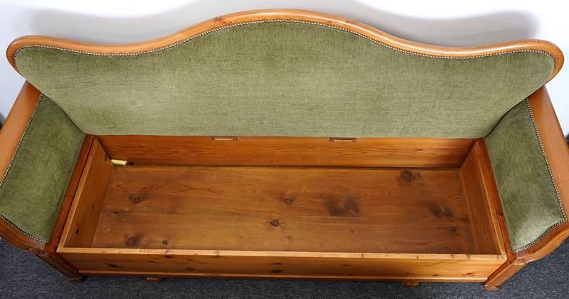 Dänemark 19. Jh. Tannenholz. Lyraförmige Steinteile auf rechteckigem Zargenkasten und geschwungene Rückenlehne. Abnehmbare Sitzfläche mit Stauraum. Größe ca. 70 x 70 cm, Höhe ca. 106 cm, Sitzfläche ca. 48 cm. Altrestaurierter Zustand wie abgebildet. Anbei Expertise von Lina's & Terry's Antiques.