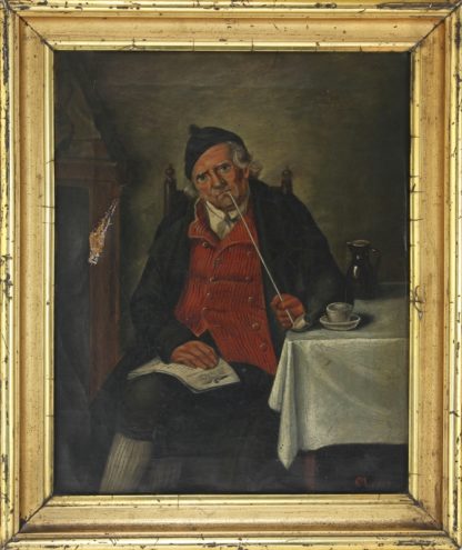 Ostade, Adriaen von Nachfolger des 19. Jh. Szene mit einem Pfeife rauchenden Mann an einem Tisch. Öl auf Leinwand. Unten rechts Monogramm und Datierung 1837. Größe ca. 31,5 x 25 cm, Rahmen ca. 37,5 x 31,5 cm. Leinwand an einer Stelle gerissen, sonst leichtes Craquelé. Ostade, Adriaen von. Successor of the 19th century. Scene with a man smoking a pipe at a table. Oil on canvas. Lower right monogram and date 1837. Size approx. 31.5 x 25 cm, frame approx. 37.5 x 31.5 cm. Canvas torn in one place, otherwise light craquelé.