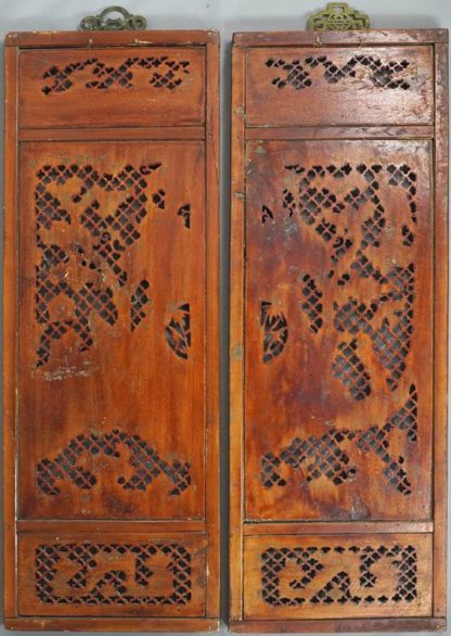 Paar chinesische Reliefpaneele China. Holz geschnitzt und rot gefasst und goldstaffiert. Durchbrochen gearbeitet mit figuralem und architektonischem Dekor. Größe je ca. 78 x 28 cm. Zustand wie abgebildet, bitte selbst besichtigen.