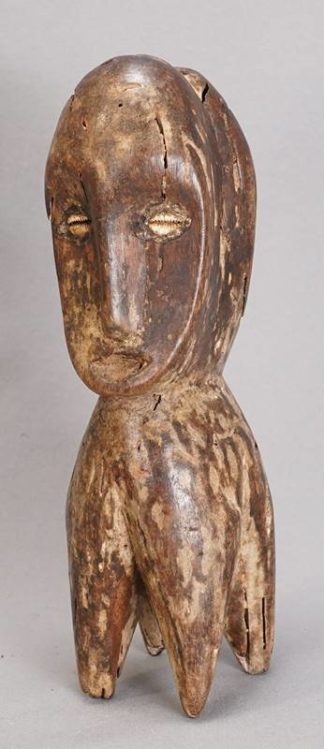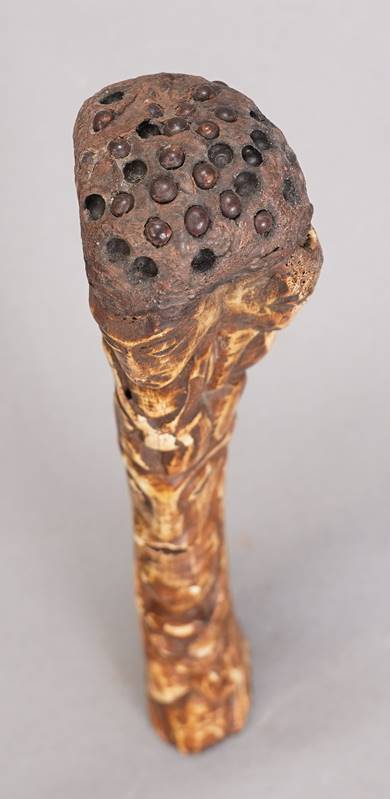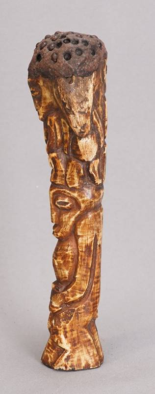 D.R. Kongo, Lega. Elefantenknochen, geschnitzt mit oben eingesetzten Samen als Dekor. Zeremonialstab/- zepter. Zweizonig aufgeteilt. Im unteren Bereich eine große männliche Figur mit kugeligem Bauch. Darüber drei weitere, kleinere Figuren, umlaufend geschnitzt. Größe ca. 6 x 6 cm, Höhe ca. 26,5 cm. Gewicht ca. 309 Gramm. Das Objekt stammt aus der süddeutschen Privatsammlung Dr. Hartmut Brie. Seine Lega-Sammlung erwarb er 1976 von einem kongolesischen Lehrer der viele Jahre bei den Lega gearbeitet und mit ihnen gelebt hat. Die Kunst der Lega konzentriert sich auf kleine Figuren und Masken, die aus Holz, aber auch aus Bein, (Figuren, holzgeschnitzte Figuren sind selten) und sogar Elefantenhaut (Masken) gefertigt werden. Sowohl Figuren als auch Masken dienen ausnahmslos den Riten des Bwame- (Bwami-) Bundes.