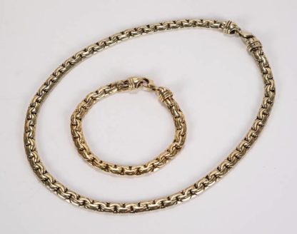 Kette mit Armband 20. Jh. Gelbgold 585. Phantasieform mit S-Gliedern. Länge ca. 47 bzw. 21 cm, Gewicht zusammen ca. 66,6 Gramm.
