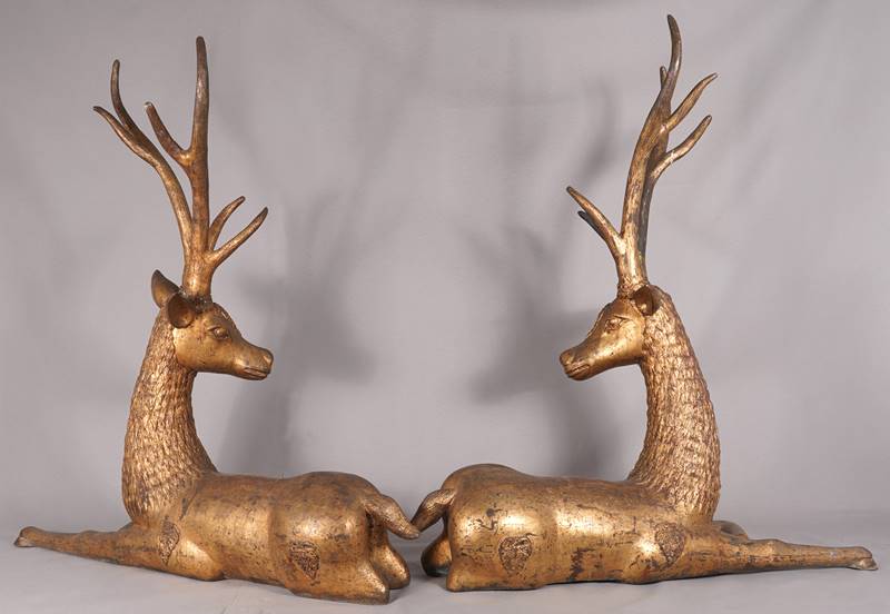 Paar Hirschskulpturen Ratanakosin-Stil. Metallguss, goldfarben patiniert. Zwei Figuren liegender Hirsche. Größe je ca. 32 x 85 cm, Höhe ca. 83 cm. Gesamtgewicht ca. 66 kg. Zustand wie abgebildet. Kein Versand möglich, wir empfehlen gerne eine Spedition.