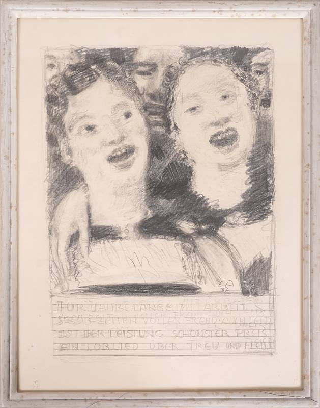 1868 Solothurn - 1961 Oschwand. "FÜR JAHRELANGE MITARBEIT S'GAB ZEITEN VOLLER FREUD. AUCH LEID IST DER LEISTUNG SCHÖNSTER PREIS EIN LOBLIED ÜBER TREU UND FLEISS". Entwurf für eine Lithographie. Bleistift auf festem Papier. Unten rechts monogrammiert und datiert (19)37, unten mittig bezeichnet. Blattgröße ca. 35,5 x 27 cm, hinter Glas gerahmt ca. 37,5 x 30 cm. Werkverzeichnis der Lithographie: Mandach 105. Provenienz: direkt beim Künstler erworben, Sammlung Eugen Loeb, Muri/Bern; Sammlung Victor Loeb, Muri/Bern; Privatsammlung Schweiz.