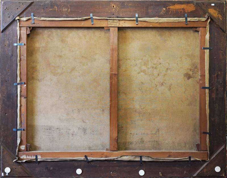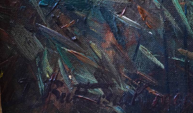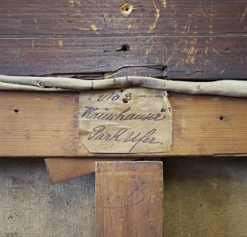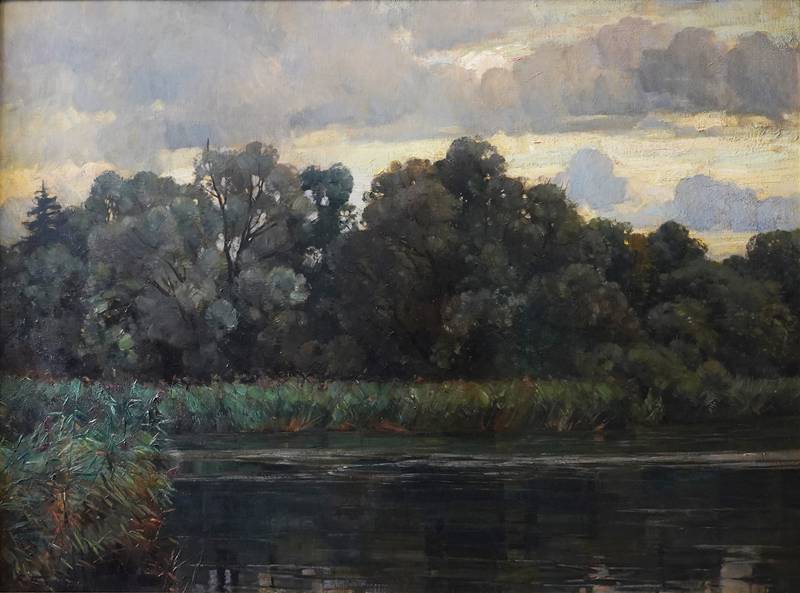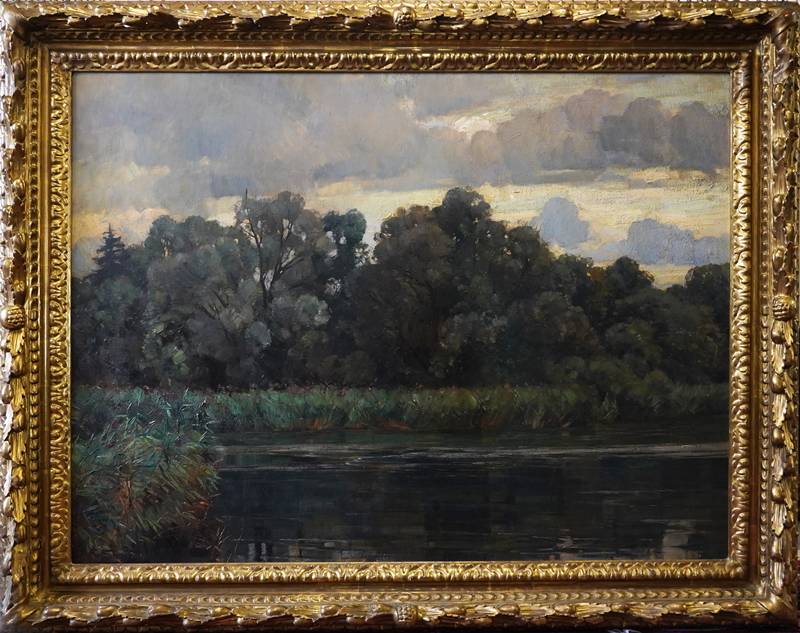 1858 Liebenzell - 1925 Icking im Isartal. "Haimhäuser Parkufer". In sommerlicher Landschaft schilfgesäumter See in Abendstimmung. Im Hintergrund unter aufziehenden Regenwolken hohe, blattreiche Bäume stehend. Öl auf Leinwand. Unten links signiert und 1909 datiert sowie verso auf Etikett betitelt. Größe ca. 90 x 120 cm, Rahmen ca. 115 x 144 cm. Kein Versand möglich, wir empfehlen gerne eine Spedition.