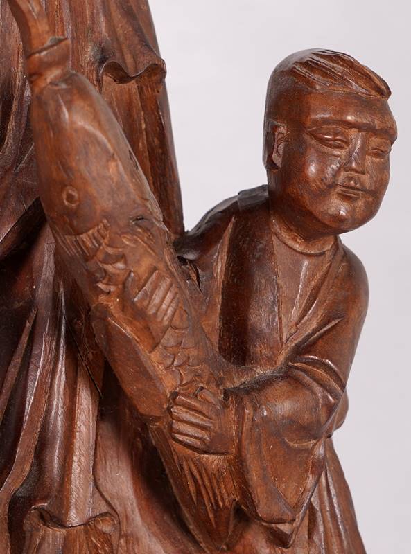 China. Holz, geschnitzt mit aufgesetzten Glasaugen. Figur eines alten Fischers auf einem durchbrochen gearbeiteten Sockel. In seiner Hand ein langer Stab mit angebundenen Fischen, zu seiner Seite ein kleiner Junge. Größe ca. 15 x 15 cm, Höhe ca. 48 cm. Gewicht ca. 3,2 kg. Teils beschädigt, teils mit Spannungsrissen, wohl teils restauriert. Ein Glasauge fehlt. Bitte selbst besichtigen.