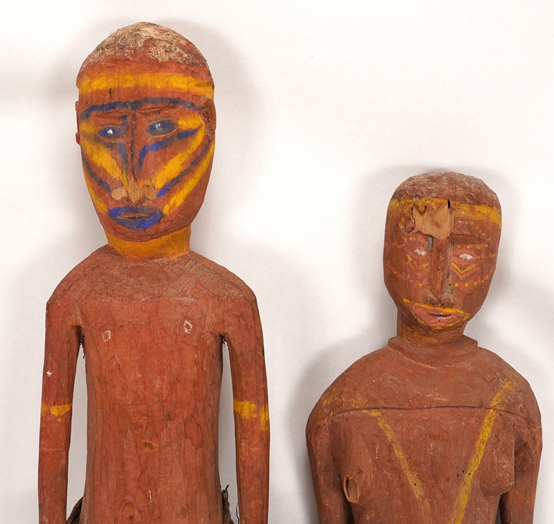 Paar Ahnenfigur Papua-Neuguinea 20. Jh. Holz, geschnitzt und polychrom gefasst. Eine männliche Figur mit Lendenschurz und eine weibliche Figur mit Bastrock, Gesicht und Körper mit bemalt. Größe ca. 15 x 10 cm, Höhe ca. 66 cm. Gewicht ca. 2,12 kg. In den 1960er Jahren bei einer privaten Expedition erworben. Teils bestoßen.