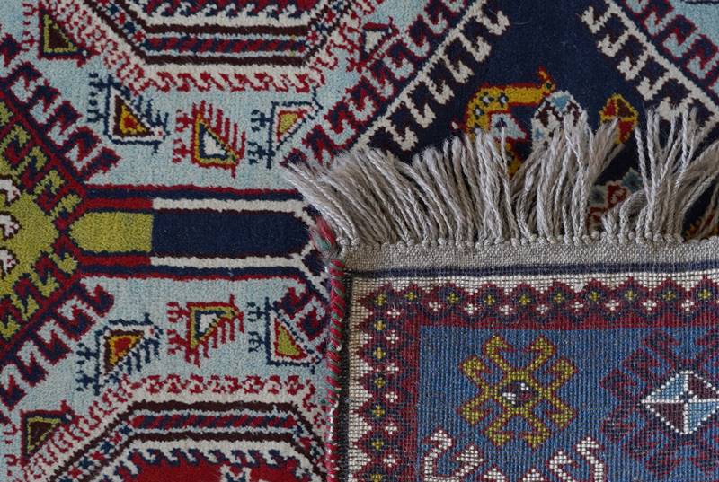 Yalameh Persien 20. Jh. Dreifachbordüre mit drei geometrischen Medaillons im Innenfeld. Verso Etikett mit Provenienz. Größe ca. 160 x 110 cm, ca. 4 x 3 Knoten/qcm. Gewicht ca. 5 kg. Zustand wie abgebildet.