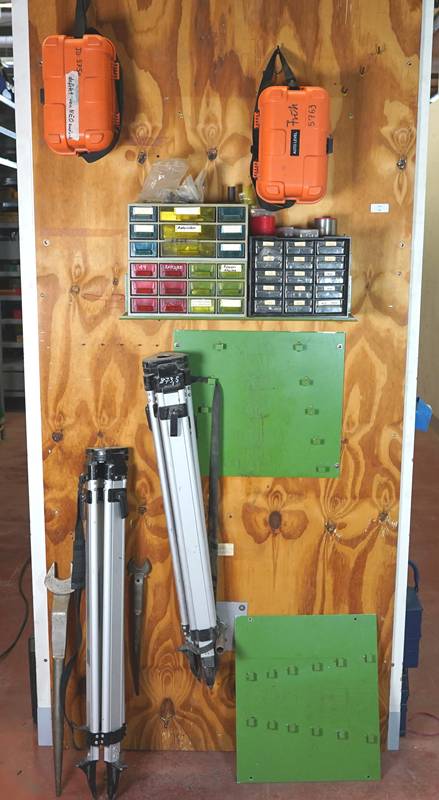 Zwei Laser einer wohl defekt mit zwei Stativen und zwei Materialkästen.